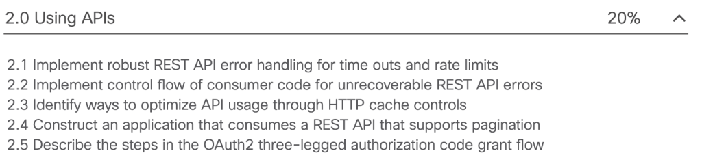 For reference, here’s a screenshot from Cisco’s website of the topics covered under 2.0 Using APIs: